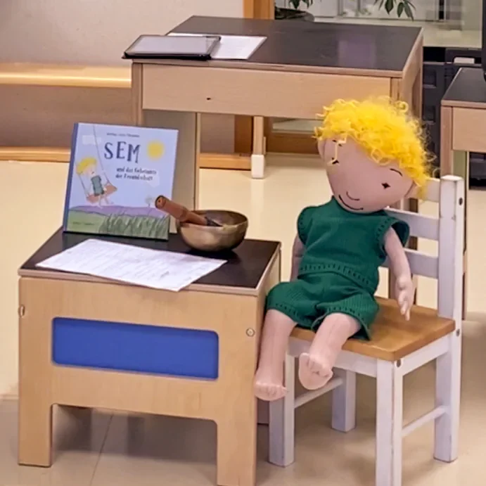 Die Kinder lassen sich von SEM (große Handpuppe und Protagonist des Kinderbuches „SEM und das Geheimnis der Freundschaft“) begeistert mitnehmen in das Land der Sinneswahrnehmung, Kreativität, Achtsamkeit und Freundschaft. Mit großen XXL Boards der Buchseiten fühlen wir mit allen Sinnen in die Erlebnisse von SEM inmitten der Natur mit Tieren, der Sonne, den Bäumen, den Blumen, aber auch Farben und Gerüchen hinein. Zu lebendiger Musik bewegen wir den Körper und achten ganz aufmerksam auf den Ton einer Klangschale. Im gemeinsamen Erzählen fördern wir ganz spielerisch und mit viel Spaß den Ausdruck des gemeinsamen Erlebens und die Fantasie.